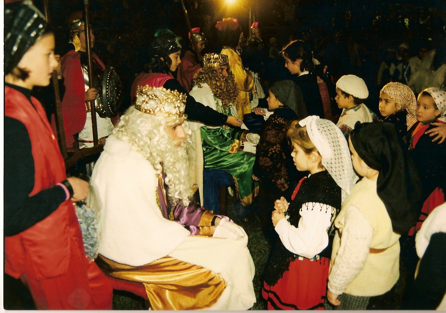 “Mientras esto sucedía en Palestina, allá en un lejano país aún más al oriente, un extraño suceso aconteció en el cielo” …… y el disparo de una palmera de fuegos de artificio pillaba siempre por sorpresa a niños y mayores. Y sonaba una música que no se cambió a lo largo de los años y la caravana de los Reyes comenzaba a acercarse al Prao del Molín, Y llegaban hasta el Portal y después se dirigían a sus tronos donde recibían a todos los niños presentes mientras los villancicos sonaban con potencia…