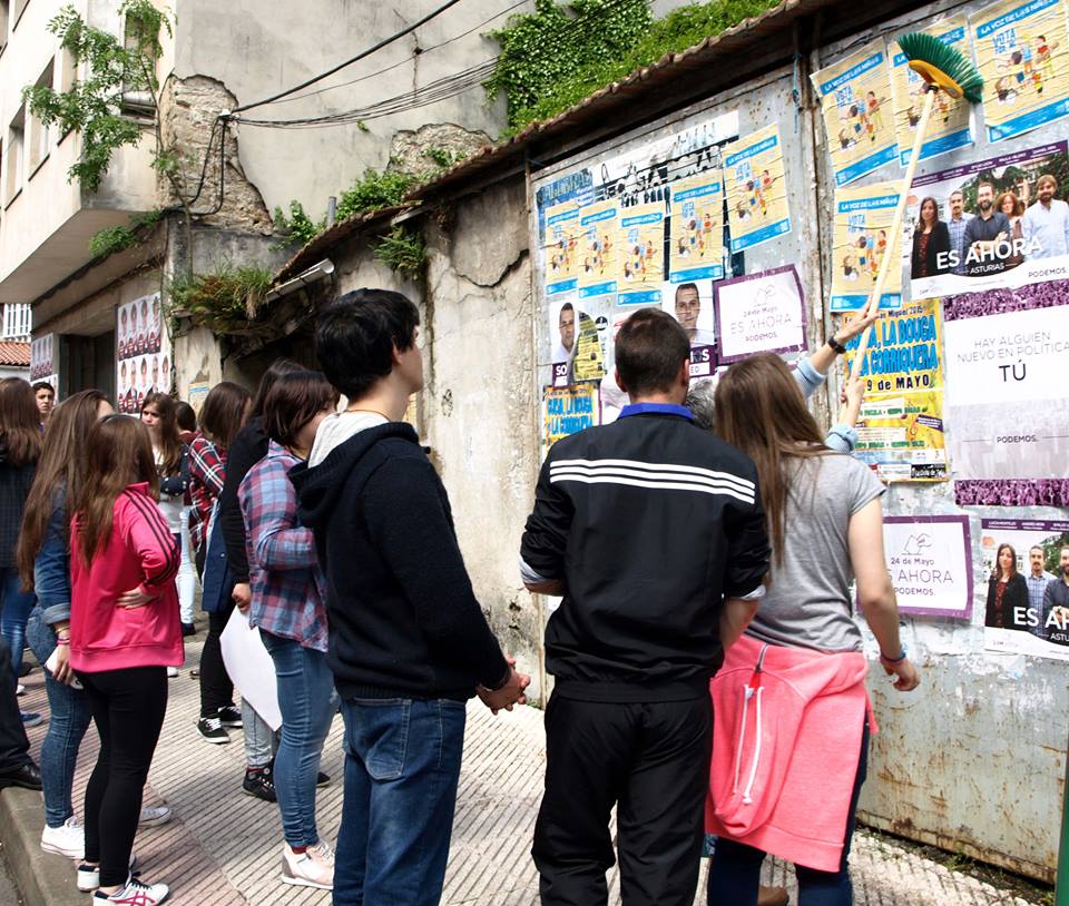 Los estudiantes pegaron sus carteles en varios espacios reservados para la campaña electoral, junto a los de partidos políticos para llamar la atención sobre su derecho a ser oídos. Semanas atrás, estudiantes del Instituto trasladaron a los candidatos a la alcaldía de Tineo una serie de propuestas para mejorar la calidad de vida y la participación social de niños y jóvenes. Durante la próxima semana analizarán los programas electorales de los partidos políticos para ver si sus demandas y propuestas han sido tenidas en cuenta.