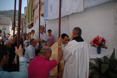 Entre las colchas y mantones que cierran las calles aparecen y desparecen muchas caras: tía Manuela Obispa y su hija Julia; tía Rosa Capaora que, por lo bajini, riñe a su hijo Gorín que ha dejado mal sujeta una de las colchas y cae dejando al descubierto la cuerda; y tía Sofía la de tío Gerardo. Entre las que cierran la calle Carretas asoman las de tía Juana y su hermana Flor; tía Teodora, tía Berenguela; tío Metralla y tío Joaquín, el de la Corralá; y tía Flor, la de tío Tostao; tía Virtudes y tío Juan Repontigo (¿?); tía Jerónima y tío Gregorio; y tío Augusto y su mujer; y tía Palmira y sus dos hijas; tía Mena, y mi madre, Inés, que a sus 93 años aún recuerda todo aquello y hasta las coplillas de los años treinta. La bendición, con toda la procesión de rodillas calle abajo, me parce aquí más solemne y en una fracción de segundo la custodia pasa de las manos de Juan Miguel a las de José Manuel, Miguel Ángel, y a las de Pedro; y a las de José Ramón; y a las de don José, y don Matías y Don Delfín. Una historia de pueblo en la sucesión de sus párrocos.