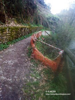 No mucho tiempo después un desprendimiento estrecha el camino peligrosamente ceca de su inicio. Hoy en día aún continuamos esperando el arreglo del tal desprendiendo. Ayuntamiento, Consejería de Medio Ambiente, Consejería de Infraestructuras, ecologistas, Confederación Hidrográfica y otros se tiran los trastos a la cabeza mientras todo sigue tal y como estaba hace ya unos años. Ahora el problema se ha extendido a muchos más tramos y la responsabilidad de su arreglo sigue siendo toreada por las administraciones para desesperación de paseantes de todo tipo y edad.