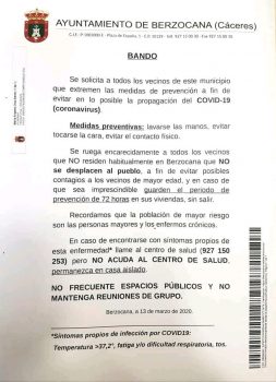 Pero hay más, la alcaldesa Nines Díaz, he emitido un bando advirtiendo de lo que ocurre y marcando determinadas pautas a seguir. Los berzocaniegos que estamos fuera habremos de replantearnos nuestras intenciones de cara a la Semana Santa. De momento nos dicen que mejor no viajemos. El pueblo tiene una población muy envejecida y podríamos andar con el dichoso virus de acá para allá perjudicando gravemente. Yo, si la cosa no cambia muy deprisa y para bien, ya he suspendido el viaje.
