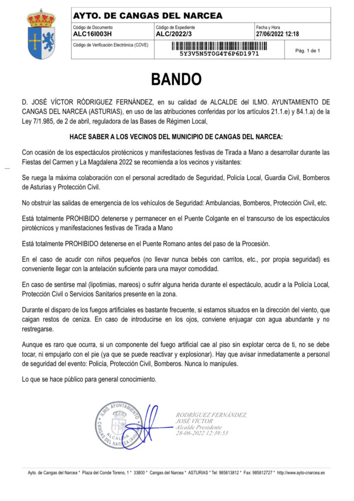 La alcaldía de Cangas del Narcea, en relación con las fiestas patronales, ha emitido los siguientes bandos