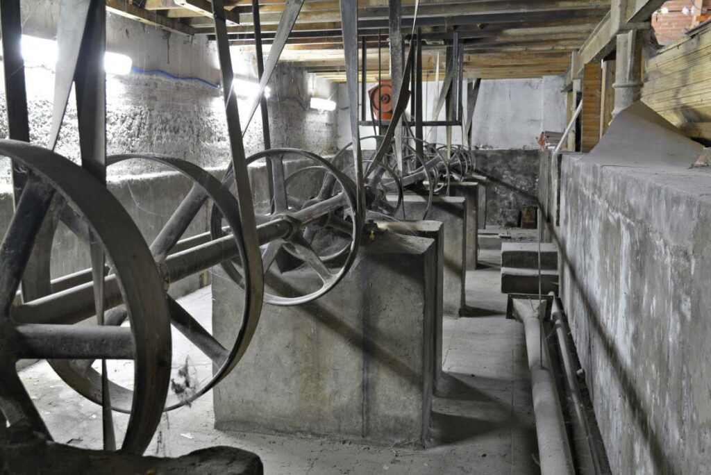 Sacudiéndonos el agua entramos en la fábrica por una puerta arcada que más correspondía a mansión que a centro de trabajo. En seguida nos aturdió el tremendo ruido que poleas, cintas y transmisiones, de cribas y aparatos diversos que configuraban un movimiento continuo que afectaba a todo el recinto.