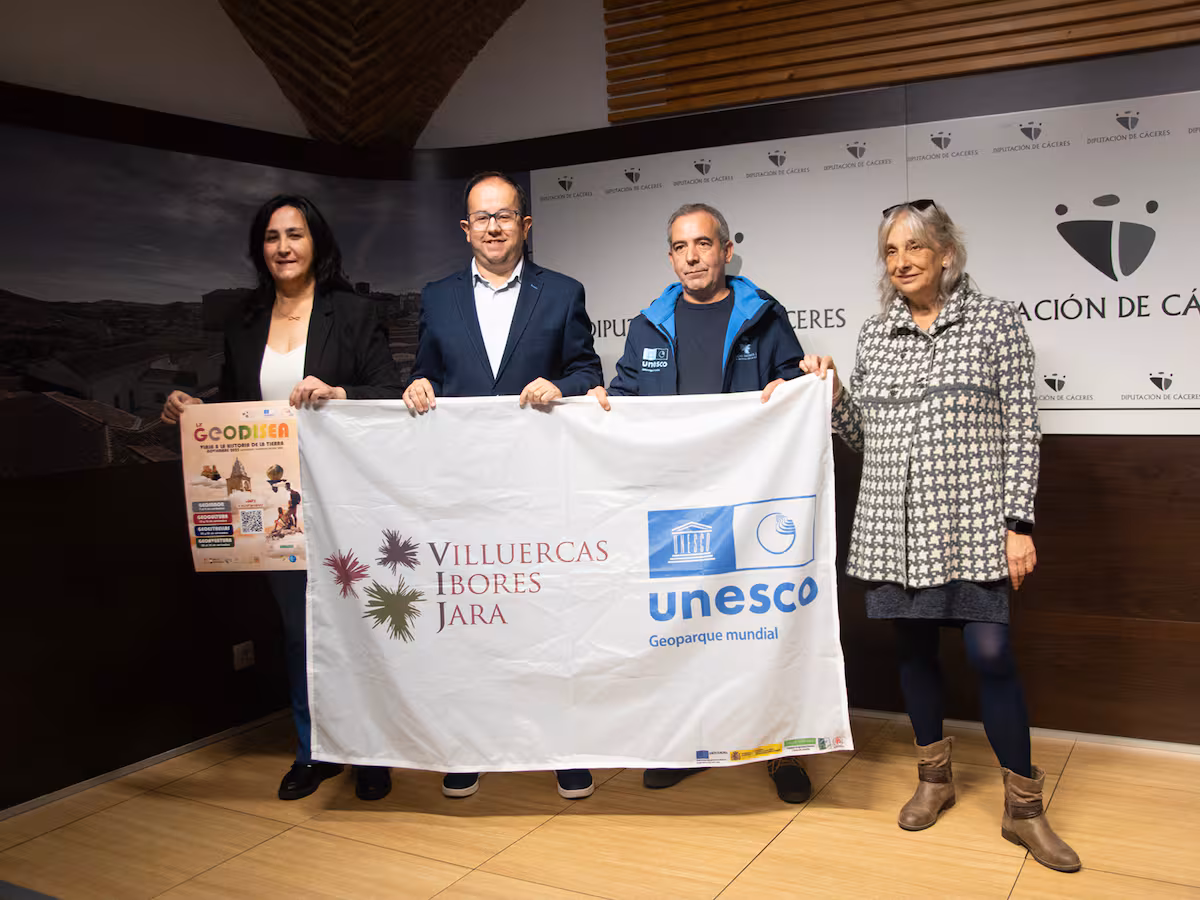 El diputado de Reto Demográfico y Espacios Naturales Protegidos de la Diputación, Javier Díaz Cieza, presentó el pasado martes la programación acompañado de la presidenta del Grupo de Acción Local Aprodervi, y alcaldesa de Berzocana, María Ángeles Díaz; de la representante de la asociación de empresarios Geovilluercas, María Paz Candela, y del presidente de la Mancomunidad de Municipios de Villuercas-Ibores-Jara, y alcalde de Peraleda de San Román, Marco Gustavo Estrella.