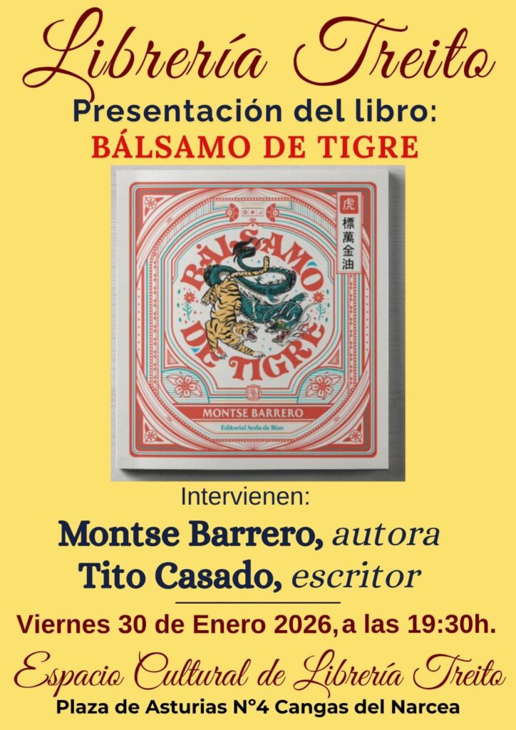 La canguesa Librería Treito acogerá una nueva presentación literaria, el próximo viernes 30 de enero. En esta ocasión, se trata de la obra «Bálsamo de tigre», de Montse Barrero. Durante la presentación, que dará comienzo a las siete y media de la tarde, la autora contará con la compañía del escritor Tito Casado.