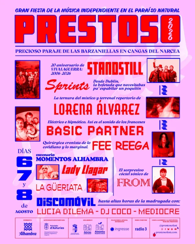 La organización celebra tener en el Prestoso a la banda «Standstill«, que está celebrando sobre los escenarios el vigésimo aniversario de su disco «Vivalaguerra». También destacan la llegada del garage-punk de los irlandeses «Sprints» o post-punk de los franceses «Bassic Partner«.