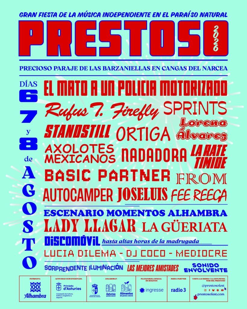 Pero no es todo lo que se podrá disfrutar en el Prestoso. Las primeras confirmaciones incluían a la banda de indie rock argentina «Él Mató a un Policía Motorizado«, a los grupos «Rufus T. Firefly«, «Nadadora» y la verbena que propone «Ortiga«. También estará la banda «Axolotes Mexicanos«, la actuación de «joseluis» y el grupo «La Rate Timide«. Además, habrá sesiones de DJ a cargo de Lucía Dilema, DJ Coco y Mediocre.