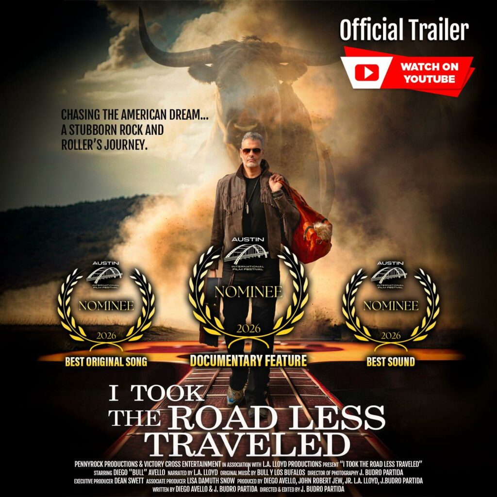 El reportaje sobre músico de Cangas del Narcea, que un día dejó su tierra natal para perseguir el sueño americano del rock and roll, acaba de recibir el apoyo de la industria del cine al lograr tres nominaciones de peso en el Austin International Film Festival de este año 2026 por su documental «I took the road less traveled», que tiene partes rodadas en Oviedo y Cangas del Narcea. El equipo de rodaje he manifestado sentirse “emocionados».