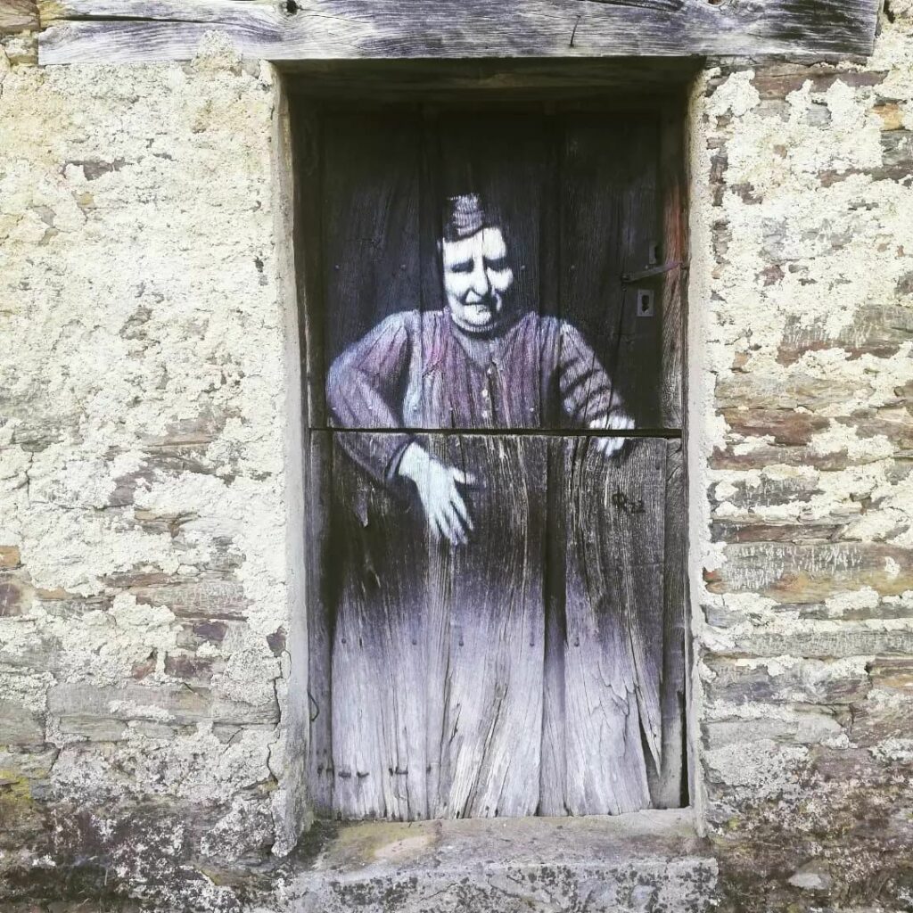 Y continúa: “A primera vista, esta aldea no difiere de otras del occidente asturiano, con sus tejados de pizarra negra, hórreos tradicionales y un silencio apenas perturbado por el viento. Sin embargo, al andar por sus calles, lo que aparece en puertas, ventanas y fachadas sorprende incluso al visitante más observador: retratos realistas, escenas domésticas y figuras humanas que parecen integrarse en el entorno. La creadora de estas intervenciones es María del Roxo, una artista vinculada al pueblo que ha convertido Villaoril en un espacio artístico excepcional”.